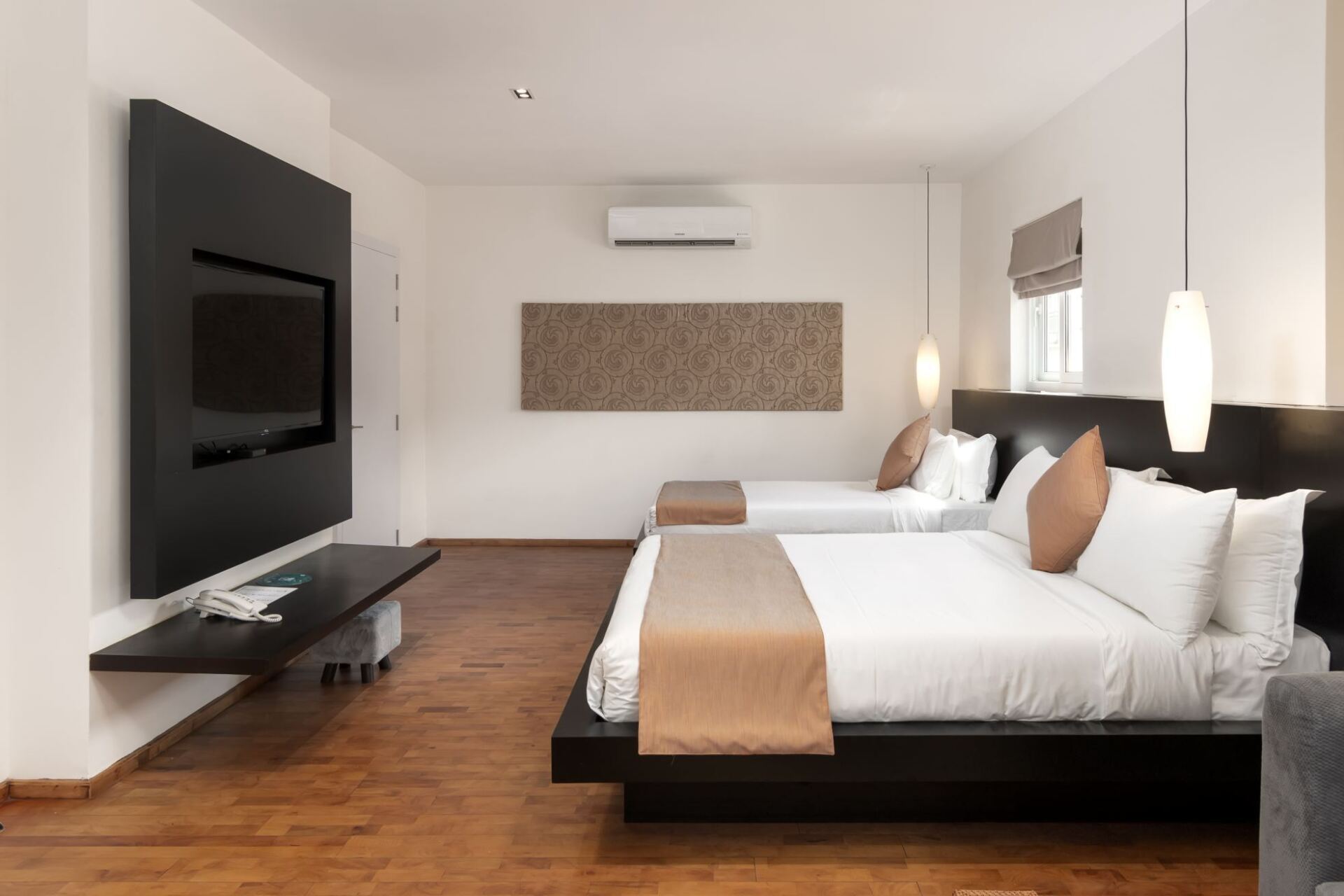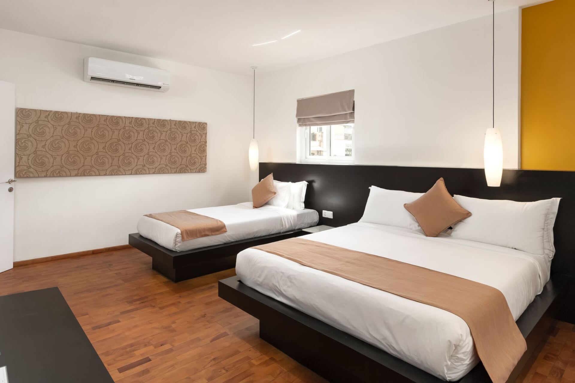 Deluxe Double Studio Suite is approximately 50m2, and are amongst Phnom Penh’s larger and finer rooms accommodating up to 3 guests in 2 separate beds. The Deluxe Double Studio comes with 1 queen size bed, 1 extra separate bed. The room is equipped with a powerful air conditioner relax sofa seat.