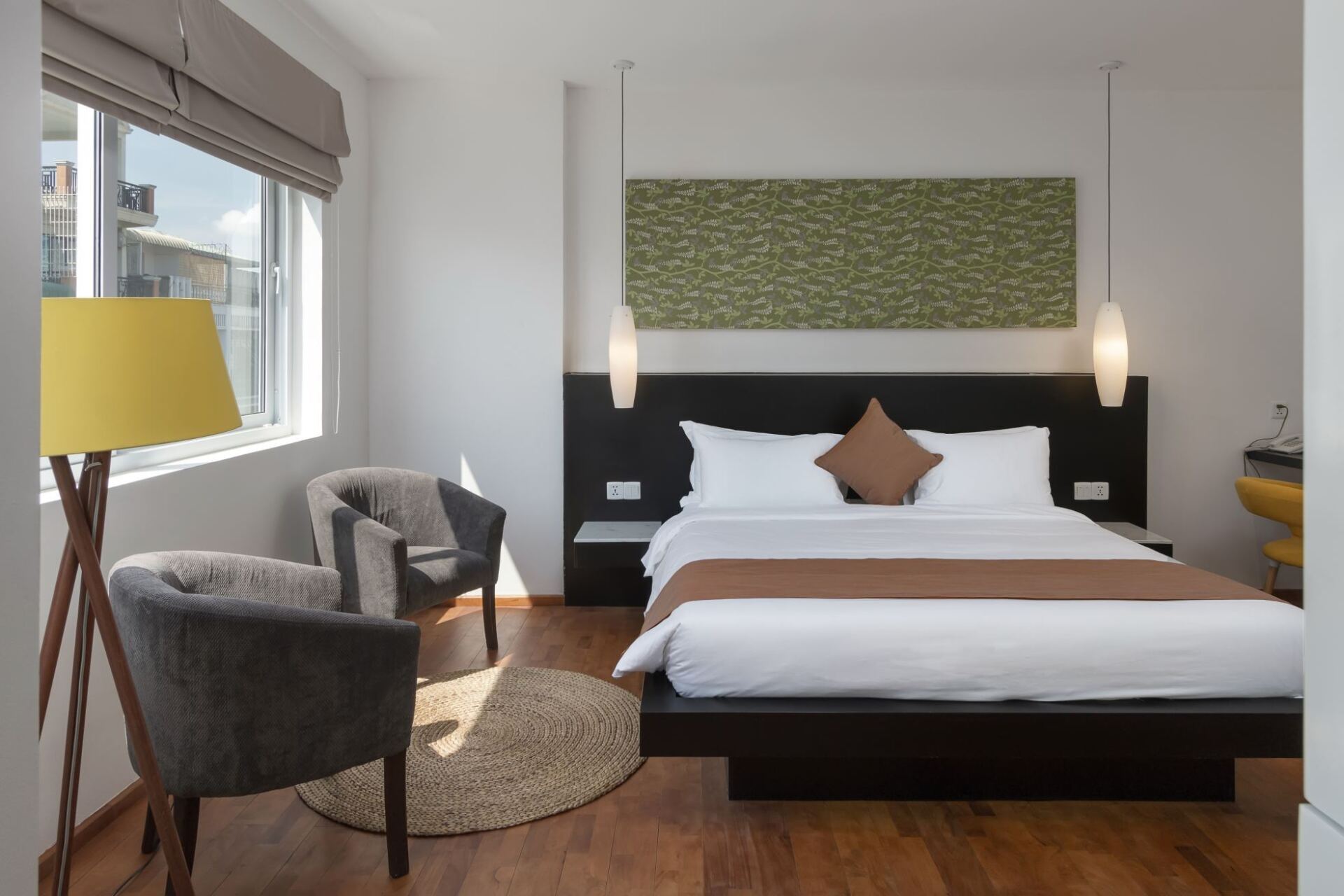 On the 3rd floor overlooking the city and with perpendicular views of the rivers Tonle Sap and the Mekong, is our Executive Suite. This is a 2-suite room measuring a royal 75m2 and features a fully equipped kitchenette, small dining table set, living room with sofa and spacious bedroom with a relaxationn corner, working station with desk and office chair. Everything connected with a smart design. Open the double-glazed windows to your own private balcony with stunning river views.