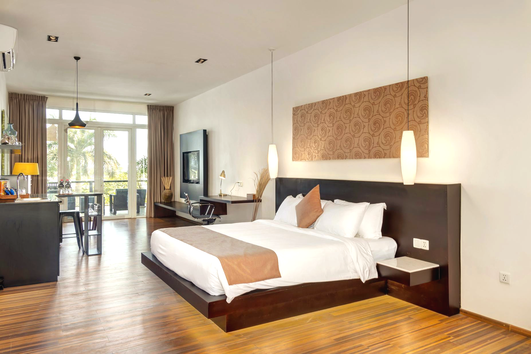 Come “home” after a long day and view the latest entertainment the 50-inch TV offering more than 70 TV channels from all over the world. Open the large sound proof windows to your balcony and treat yourself to a cool drink from your own minibar and relax whilst overlooking the hustle and bustle down on Street 144 and perpendicular views of the Mekong and Tonle Sap rivers.