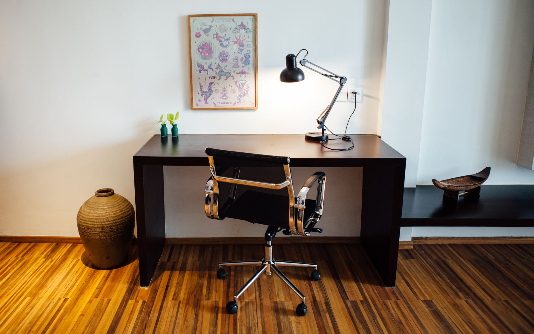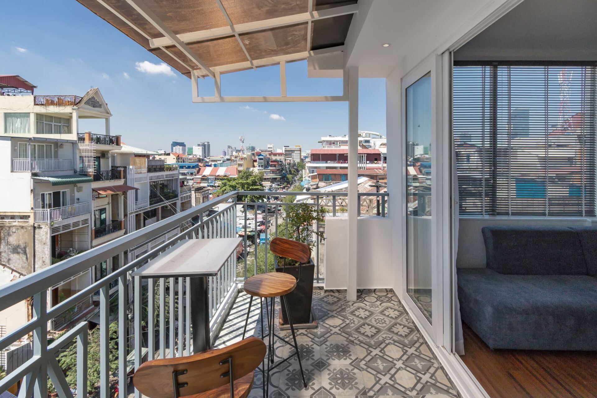 The Penthouse Suite is our most exclusive suite, situated on the top 4th floor offering a large private balcony with daybed and stunning panoramic views on the Tonle Sap and Mekong rivers, and city ever growing skyline. The Penthouse Suite was additionally built in 2018 and comes with a refined smart interior design, wooden flooring and soundproof windows.